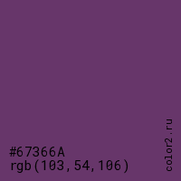 Цвет #67366A в цветовой модели RGB обозначается тремя октетами (103, 54, 106) в десятичном формате и #67366A в шестнадцатиричном (hex) формате, которые являются интенсивностью красного 103 (hex 67), интенсивность зелёного 54 (hex 36) и интенсивность синего 106 (hex 6A).