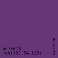 Цвет #673678 в цветовой модели RGB обозначается тремя октетами (103, 54, 120) в десятичном формате и #673678 в шестнадцатиричном (hex) формате, которые являются интенсивностью красного 103 (hex 67), интенсивность зелёного 54 (hex 36) и интенсивность синего 120 (hex 78).