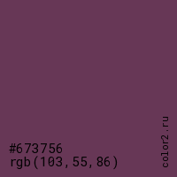 Цвет #673756 в цветовой модели RGB обозначается тремя октетами (103, 55, 86) в десятичном формате и #673756 в шестнадцатиричном (hex) формате, которые являются интенсивностью красного 103 (hex 67), интенсивность зелёного 55 (hex 37) и интенсивность синего 86 (hex 56).