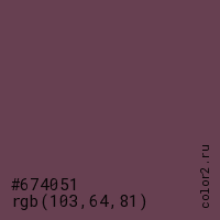 Цвет #674051 в цветовой модели RGB обозначается тремя октетами (103, 64, 81) в десятичном формате и #674051 в шестнадцатиричном (hex) формате, которые являются интенсивностью красного 103 (hex 67), интенсивность зелёного 64 (hex 40) и интенсивность синего 81 (hex 51).
