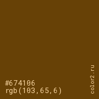 Цвет #674106 в цветовой модели RGB обозначается тремя октетами (103, 65, 6) в десятичном формате и #674106 в шестнадцатиричном (hex) формате, которые являются интенсивностью красного 103 (hex 67), интенсивность зелёного 65 (hex 41) и интенсивность синего 6 (hex 06).