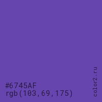 Цвет #6745AF в цветовой модели RGB обозначается тремя октетами (103, 69, 175) в десятичном формате и #6745AF в шестнадцатиричном (hex) формате, которые являются интенсивностью красного 103 (hex 67), интенсивность зелёного 69 (hex 45) и интенсивность синего 175 (hex AF).