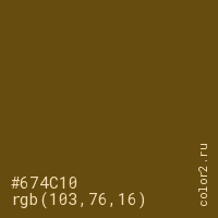 Цвет #674C10 в цветовой модели RGB обозначается тремя октетами (103, 76, 16) в десятичном формате и #674C10 в шестнадцатиричном (hex) формате, которые являются интенсивностью красного 103 (hex 67), интенсивность зелёного 76 (hex 4C) и интенсивность синего 16 (hex 10).