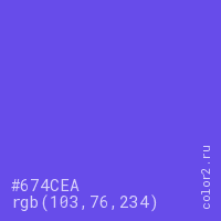 Цвет #674CEA в цветовой модели RGB обозначается тремя октетами (103, 76, 234) в десятичном формате и #674CEA в шестнадцатиричном (hex) формате, которые являются интенсивностью красного 103 (hex 67), интенсивность зелёного 76 (hex 4C) и интенсивность синего 234 (hex EA).