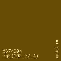Цвет #674D04 в цветовой модели RGB обозначается тремя октетами (103, 77, 4) в десятичном формате и #674D04 в шестнадцатиричном (hex) формате, которые являются интенсивностью красного 103 (hex 67), интенсивность зелёного 77 (hex 4D) и интенсивность синего 4 (hex 04).