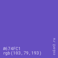 Цвет #674FC1 в цветовой модели RGB обозначается тремя октетами (103, 79, 193) в десятичном формате и #674FC1 в шестнадцатиричном (hex) формате, которые являются интенсивностью красного 103 (hex 67), интенсивность зелёного 79 (hex 4F) и интенсивность синего 193 (hex C1).