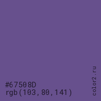 Цвет #67508D в цветовой модели RGB обозначается тремя октетами (103, 80, 141) в десятичном формате и #67508D в шестнадцатиричном (hex) формате, которые являются интенсивностью красного 103 (hex 67), интенсивность зелёного 80 (hex 50) и интенсивность синего 141 (hex 8D).