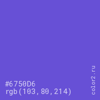 Цвет #6750D6 в цветовой модели RGB обозначается тремя октетами (103, 80, 214) в десятичном формате и #6750D6 в шестнадцатиричном (hex) формате, которые являются интенсивностью красного 103 (hex 67), интенсивность зелёного 80 (hex 50) и интенсивность синего 214 (hex D6).
