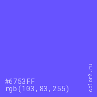 Цвет #6753FF в цветовой модели RGB обозначается тремя октетами (103, 83, 255) в десятичном формате и #6753FF в шестнадцатиричном (hex) формате, которые являются интенсивностью красного 103 (hex 67), интенсивность зелёного 83 (hex 53) и интенсивность синего 255 (hex FF).