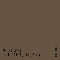Цвет #675543 в цветовой модели RGB обозначается тремя октетами (103, 85, 67) в десятичном формате и #675543 в шестнадцатиричном (hex) формате, которые являются интенсивностью красного 103 (hex 67), интенсивность зелёного 85 (hex 55) и интенсивность синего 67 (hex 43).