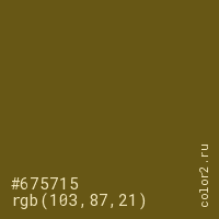 Цвет #675715 в цветовой модели RGB обозначается тремя октетами (103, 87, 21) в десятичном формате и #675715 в шестнадцатиричном (hex) формате, которые являются интенсивностью красного 103 (hex 67), интенсивность зелёного 87 (hex 57) и интенсивность синего 21 (hex 15).