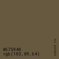 Цвет #675940 в цветовой модели RGB обозначается тремя октетами (103, 89, 64) в десятичном формате и #675940 в шестнадцатиричном (hex) формате, которые являются интенсивностью красного 103 (hex 67), интенсивность зелёного 89 (hex 59) и интенсивность синего 64 (hex 40).