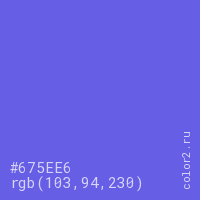 Цвет #675EE6 в цветовой модели RGB обозначается тремя октетами (103, 94, 230) в десятичном формате и #675EE6 в шестнадцатиричном (hex) формате, которые являются интенсивностью красного 103 (hex 67), интенсивность зелёного 94 (hex 5E) и интенсивность синего 230 (hex E6).