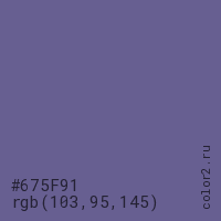 Цвет #675F91 в цветовой модели RGB обозначается тремя октетами (103, 95, 145) в десятичном формате и #675F91 в шестнадцатиричном (hex) формате, которые являются интенсивностью красного 103 (hex 67), интенсивность зелёного 95 (hex 5F) и интенсивность синего 145 (hex 91).