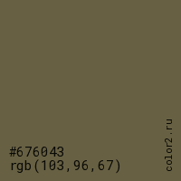 Цвет #676043 в цветовой модели RGB обозначается тремя октетами (103, 96, 67) в десятичном формате и #676043 в шестнадцатиричном (hex) формате, которые являются интенсивностью красного 103 (hex 67), интенсивность зелёного 96 (hex 60) и интенсивность синего 67 (hex 43).