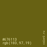 Цвет #676113 в цветовой модели RGB обозначается тремя октетами (103, 97, 19) в десятичном формате и #676113 в шестнадцатиричном (hex) формате, которые являются интенсивностью красного 103 (hex 67), интенсивность зелёного 97 (hex 61) и интенсивность синего 19 (hex 13).
