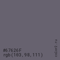 Цвет #67626F в цветовой модели RGB обозначается тремя октетами (103, 98, 111) в десятичном формате и #67626F в шестнадцатиричном (hex) формате, которые являются интенсивностью красного 103 (hex 67), интенсивность зелёного 98 (hex 62) и интенсивность синего 111 (hex 6F).