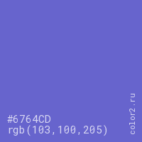 Цвет #6764CD в цветовой модели RGB обозначается тремя октетами (103, 100, 205) в десятичном формате и #6764CD в шестнадцатиричном (hex) формате, которые являются интенсивностью красного 103 (hex 67), интенсивность зелёного 100 (hex 64) и интенсивность синего 205 (hex CD).