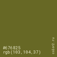 Цвет #676825 в цветовой модели RGB обозначается тремя октетами (103, 104, 37) в десятичном формате и #676825 в шестнадцатиричном (hex) формате, которые являются интенсивностью красного 103 (hex 67), интенсивность зелёного 104 (hex 68) и интенсивность синего 37 (hex 25).