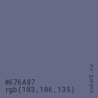 Цвет #676A87 в цветовой модели RGB обозначается тремя октетами (103, 106, 135) в десятичном формате и #676A87 в шестнадцатиричном (hex) формате, которые являются интенсивностью красного 103 (hex 67), интенсивность зелёного 106 (hex 6A) и интенсивность синего 135 (hex 87).