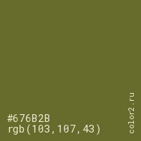 Цвет #676B2B в цветовой модели RGB обозначается тремя октетами (103, 107, 43) в десятичном формате и #676B2B в шестнадцатиричном (hex) формате, которые являются интенсивностью красного 103 (hex 67), интенсивность зелёного 107 (hex 6B) и интенсивность синего 43 (hex 2B).