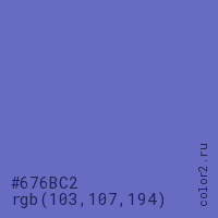 Цвет #676BC2 в цветовой модели RGB обозначается тремя октетами (103, 107, 194) в десятичном формате и #676BC2 в шестнадцатиричном (hex) формате, которые являются интенсивностью красного 103 (hex 67), интенсивность зелёного 107 (hex 6B) и интенсивность синего 194 (hex C2).