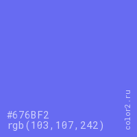 Цвет #676BF2 в цветовой модели RGB обозначается тремя октетами (103, 107, 242) в десятичном формате и #676BF2 в шестнадцатиричном (hex) формате, которые являются интенсивностью красного 103 (hex 67), интенсивность зелёного 107 (hex 6B) и интенсивность синего 242 (hex F2).