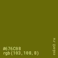 Цвет #676C08 в цветовой модели RGB обозначается тремя октетами (103, 108, 8) в десятичном формате и #676C08 в шестнадцатиричном (hex) формате, которые являются интенсивностью красного 103 (hex 67), интенсивность зелёного 108 (hex 6C) и интенсивность синего 8 (hex 08).