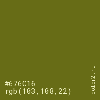 Цвет #676C16 в цветовой модели RGB обозначается тремя октетами (103, 108, 22) в десятичном формате и #676C16 в шестнадцатиричном (hex) формате, которые являются интенсивностью красного 103 (hex 67), интенсивность зелёного 108 (hex 6C) и интенсивность синего 22 (hex 16).