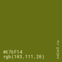 Цвет #676F14 в цветовой модели RGB обозначается тремя октетами (103, 111, 20) в десятичном формате и #676F14 в шестнадцатиричном (hex) формате, которые являются интенсивностью красного 103 (hex 67), интенсивность зелёного 111 (hex 6F) и интенсивность синего 20 (hex 14).