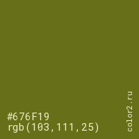 Цвет #676F19 в цветовой модели RGB обозначается тремя октетами (103, 111, 25) в десятичном формате и #676F19 в шестнадцатиричном (hex) формате, которые являются интенсивностью красного 103 (hex 67), интенсивность зелёного 111 (hex 6F) и интенсивность синего 25 (hex 19).