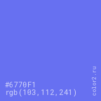 Цвет #6770F1 в цветовой модели RGB обозначается тремя октетами (103, 112, 241) в десятичном формате и #6770F1 в шестнадцатиричном (hex) формате, которые являются интенсивностью красного 103 (hex 67), интенсивность зелёного 112 (hex 70) и интенсивность синего 241 (hex F1).
