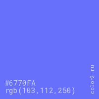 Цвет #6770FA в цветовой модели RGB обозначается тремя октетами (103, 112, 250) в десятичном формате и #6770FA в шестнадцатиричном (hex) формате, которые являются интенсивностью красного 103 (hex 67), интенсивность зелёного 112 (hex 70) и интенсивность синего 250 (hex FA).