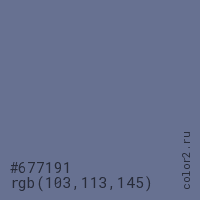 Цвет #677191 в цветовой модели RGB обозначается тремя октетами (103, 113, 145) в десятичном формате и #677191 в шестнадцатиричном (hex) формате, которые являются интенсивностью красного 103 (hex 67), интенсивность зелёного 113 (hex 71) и интенсивность синего 145 (hex 91).