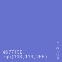 Цвет #6771CE в цветовой модели RGB обозначается тремя октетами (103, 113, 206) в десятичном формате и #6771CE в шестнадцатиричном (hex) формате, которые являются интенсивностью красного 103 (hex 67), интенсивность зелёного 113 (hex 71) и интенсивность синего 206 (hex CE).