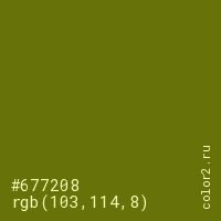 Цвет #677208 в цветовой модели RGB обозначается тремя октетами (103, 114, 8) в десятичном формате и #677208 в шестнадцатиричном (hex) формате, которые являются интенсивностью красного 103 (hex 67), интенсивность зелёного 114 (hex 72) и интенсивность синего 8 (hex 08).