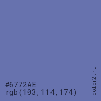 Цвет #6772AE в цветовой модели RGB обозначается тремя октетами (103, 114, 174) в десятичном формате и #6772AE в шестнадцатиричном (hex) формате, которые являются интенсивностью красного 103 (hex 67), интенсивность зелёного 114 (hex 72) и интенсивность синего 174 (hex AE).