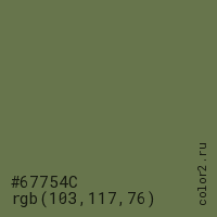 Цвет #67754C в цветовой модели RGB обозначается тремя октетами (103, 117, 76) в десятичном формате и #67754C в шестнадцатиричном (hex) формате, которые являются интенсивностью красного 103 (hex 67), интенсивность зелёного 117 (hex 75) и интенсивность синего 76 (hex 4C).