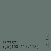 Цвет #677571 в цветовой модели RGB обозначается тремя октетами (103, 117, 113) в десятичном формате и #677571 в шестнадцатиричном (hex) формате, которые являются интенсивностью красного 103 (hex 67), интенсивность зелёного 117 (hex 75) и интенсивность синего 113 (hex 71).