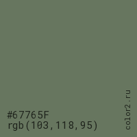 Цвет #67765F в цветовой модели RGB обозначается тремя октетами (103, 118, 95) в десятичном формате и #67765F в шестнадцатиричном (hex) формате, которые являются интенсивностью красного 103 (hex 67), интенсивность зелёного 118 (hex 76) и интенсивность синего 95 (hex 5F).