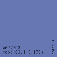 Цвет #6777B3 в цветовой модели RGB обозначается тремя октетами (103, 119, 179) в десятичном формате и #6777B3 в шестнадцатиричном (hex) формате, которые являются интенсивностью красного 103 (hex 67), интенсивность зелёного 119 (hex 77) и интенсивность синего 179 (hex B3).