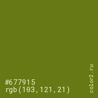 Цвет #677915 в цветовой модели RGB обозначается тремя октетами (103, 121, 21) в десятичном формате и #677915 в шестнадцатиричном (hex) формате, которые являются интенсивностью красного 103 (hex 67), интенсивность зелёного 121 (hex 79) и интенсивность синего 21 (hex 15).