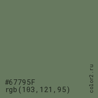 Цвет #67795F в цветовой модели RGB обозначается тремя октетами (103, 121, 95) в десятичном формате и #67795F в шестнадцатиричном (hex) формате, которые являются интенсивностью красного 103 (hex 67), интенсивность зелёного 121 (hex 79) и интенсивность синего 95 (hex 5F).