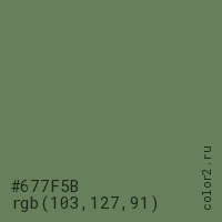 Цвет #677F5B в цветовой модели RGB обозначается тремя октетами (103, 127, 91) в десятичном формате и #677F5B в шестнадцатиричном (hex) формате, которые являются интенсивностью красного 103 (hex 67), интенсивность зелёного 127 (hex 7F) и интенсивность синего 91 (hex 5B).