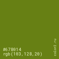 Цвет #678014 в цветовой модели RGB обозначается тремя октетами (103, 128, 20) в десятичном формате и #678014 в шестнадцатиричном (hex) формате, которые являются интенсивностью красного 103 (hex 67), интенсивность зелёного 128 (hex 80) и интенсивность синего 20 (hex 14).