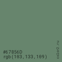 Цвет #67856D в цветовой модели RGB обозначается тремя октетами (103, 133, 109) в десятичном формате и #67856D в шестнадцатиричном (hex) формате, которые являются интенсивностью красного 103 (hex 67), интенсивность зелёного 133 (hex 85) и интенсивность синего 109 (hex 6D).