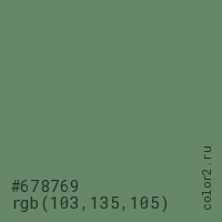 Цвет #678769 в цветовой модели RGB обозначается тремя октетами (103, 135, 105) в десятичном формате и #678769 в шестнадцатиричном (hex) формате, которые являются интенсивностью красного 103 (hex 67), интенсивность зелёного 135 (hex 87) и интенсивность синего 105 (hex 69).