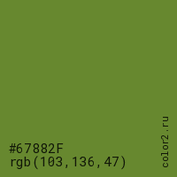 Цвет #67882F в цветовой модели RGB обозначается тремя октетами (103, 136, 47) в десятичном формате и #67882F в шестнадцатиричном (hex) формате, которые являются интенсивностью красного 103 (hex 67), интенсивность зелёного 136 (hex 88) и интенсивность синего 47 (hex 2F).