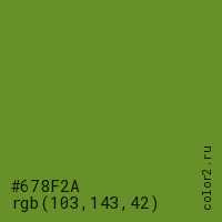 Цвет #678F2A в цветовой модели RGB обозначается тремя октетами (103, 143, 42) в десятичном формате и #678F2A в шестнадцатиричном (hex) формате, которые являются интенсивностью красного 103 (hex 67), интенсивность зелёного 143 (hex 8F) и интенсивность синего 42 (hex 2A).