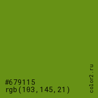 Цвет #679115 в цветовой модели RGB обозначается тремя октетами (103, 145, 21) в десятичном формате и #679115 в шестнадцатиричном (hex) формате, которые являются интенсивностью красного 103 (hex 67), интенсивность зелёного 145 (hex 91) и интенсивность синего 21 (hex 15).